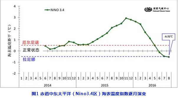 自2014年9月開始的超強(qiáng)厄爾尼諾事件于2016年5月結(jié)束后,赤道附近中東太平洋海表溫度持續(xù)走低。8月份監(jiān)測結(jié)果表明,拉尼娜/厄爾尼諾監(jiān)測區(qū)海溫距平指數(shù)較上月又下降0.05℃,達(dá)到了-0.53℃,表明赤道中東太平洋海表溫度已偏離正常,進(jìn)入拉尼娜狀態(tài)(見圖1)。