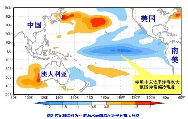 名詞解釋:拉尼娜(西班牙語“LaNina”),原意是“小女孩”,也稱為“反厄爾尼諾”,一般以西經(jīng)120~170度及南北緯5度之間的赤道太平洋海區(qū)的海溫距平指數(shù)來判定。當(dāng)該區(qū)海溫距平低于-0.5℃,則稱之為進(jìn)入“拉尼娜狀態(tài)”;若“拉尼娜狀態(tài)”持續(xù)5個月以上,則判定為一次“拉尼娜事件”(見圖2)。拉尼娜事件一般2至7年發(fā)生一次,1950年以來共發(fā)生了14次�!袄崮取焙汀岸驙柲嶂Z”都是導(dǎo)致全球氣候異常的重大天氣氣候事件之一。