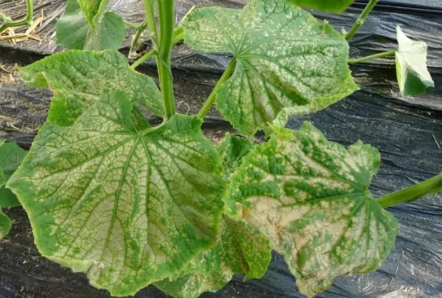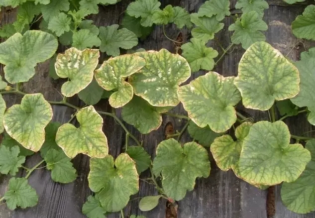 棚室內(nèi)施用大量生餅肥、有機(jī)糞肥后,由于溫度較高,在腐解過(guò)程中會(huì)產(chǎn)生大量硫化氫,硫化氫在空氣中進(jìn)一步氧化生成二氧化硫。二氧化硫氣體由氣孔進(jìn)入葉片,再溶解浸潤(rùn)到細(xì)胞壁的水分中,使葉肉組織失去膨壓而萎蔫,產(chǎn)生水漬斑,最后變成白色,在葉片上出現(xiàn)界限分明的點(diǎn)狀或塊狀壞死斑,嚴(yán)重時(shí)斑點(diǎn)可連接成片,造成全部葉片枯黃。