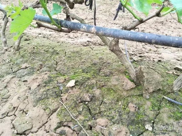 去年秋天葡萄小鎮(zhèn)的部分種植戶來到農(nóng)大實(shí)驗(yàn)站,聽取農(nóng)業(yè)專家講解葡萄管理技術(shù),講解了他們這種傳統(tǒng)種植方法的弊端,不腐熟的農(nóng)家肥和劣質(zhì)有機(jī)肥不僅會(huì)對(duì)做物造成燒苗,還會(huì)帶入大量病菌造成作物土傳病害嚴(yán)重,使土壤板結(jié)和鹽漬化,作物不能正常生長,最終導(dǎo)致減產(chǎn)。如下圖,地表長綠苔,PH值在8.5,偏堿,超出葡萄正常生長范圍