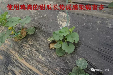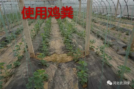 據(jù)了解這兩個使用雞糞的甜瓜棚室和使用農(nóng)沃綠生物有機(jī)肥的甜瓜同一天定植,但生長期要差了十多天。