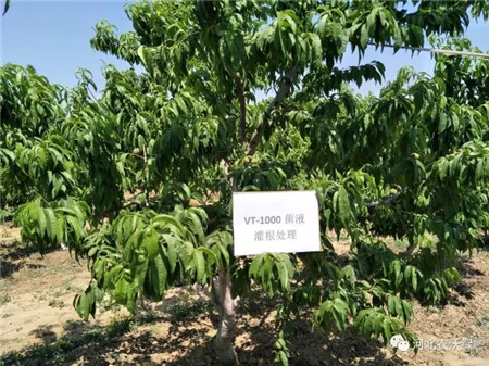 灌根處理后,原來(lái)沒發(fā)病的桃樹陸續(xù)又有的開始發(fā)病,桃樹的枝葉開始發(fā)黃枯萎,長(zhǎng)勢(shì)弱,沒有坐果,病害還在蔓延。為了消除整個(gè)桃園土壤有害病菌,用農(nóng)沃綠VT-1000菌液在澆水的時(shí)候沖施到果園,畝用菌液2公斤。張社長(zhǎng)還把農(nóng)沃綠VT-1000菌液推薦給了其他果農(nóng),說我們的產(chǎn)品效果這么好,一定要讓更多人知道,讓大家都用上好產(chǎn)品。