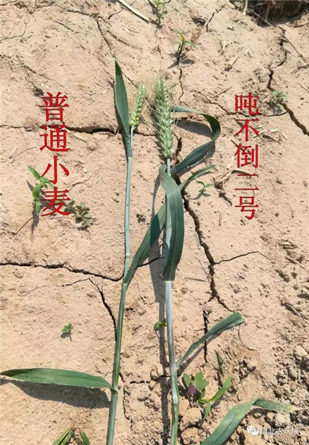 噸不倒2號(hào)小麥沒(méi)有出現(xiàn)倒伏,相鄰地塊種植的普通小麥倒伏嚴(yán)重