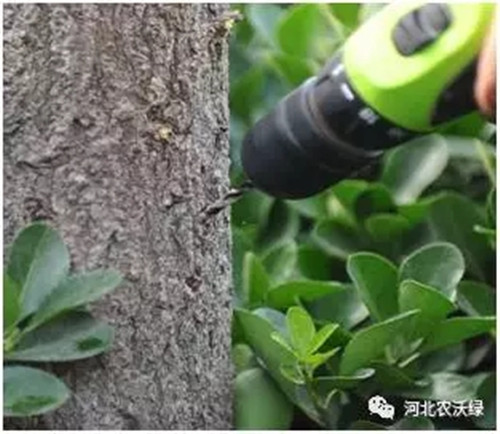 (1)、鉆孔位置樹干30-50cm處,4~4.5mm鉆頭,斜45°角向下,孔的深度3cm左右,達到木質(zhì)部。