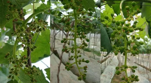 在葡萄開花期溫度要控制在白天25度到28度之間,夜間溫度在15度到18度之間。在葡萄開花前噴施硼元素。