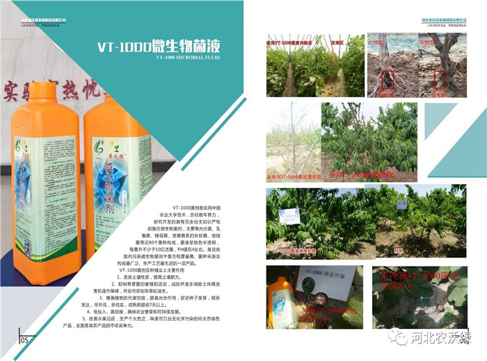 因此,在果園施肥上提倡生物有機肥與無機肥相結(jié)合結(jié)合,單一依靠大化肥的施肥方式持續(xù)得越久,對果園土壤的傷害越嚴重,對土壤問題嚴重的果園,應使用VT-1000菌劑進行沖施,VT-1000菌劑是應用中國農(nóng)業(yè)大學技術(shù)歷經(jīng)數(shù)年研制而成,每毫升不少于10億活菌,使用后可以起到改良果園土壤的作用,促進土壤團粒化保水保肥,還能抑制雜草滋生,提高果樹的抗病能力。增施生物有機肥,提高土壤有機質(zhì),改良土壤環(huán)境是果園施肥的發(fā)展方向。