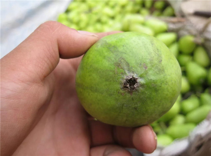 巴梨、黃金梨等品種發(fā)生鐵頭病。鐵頭病嚴重時,巴梨花萼周圍出現(xiàn)細胞壞死呈干腐癥狀;萊陽梨、豐水梨等品種出現(xiàn)皮厚、果肉粗、果核大的癥狀。