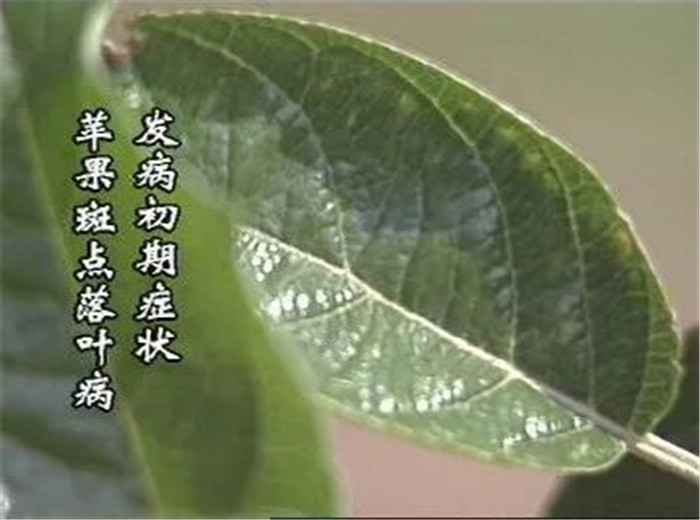 褐斑病主要危害葉片,也能侵染果實和葉柄。樹冠下部和內(nèi)膛葉片先發(fā)病。發(fā)病初期葉片上出現(xiàn)褐色小點(diǎn),后擴(kuò)展為0.5—3.0 厘米的褐色大斑,邊緣綠色,不整齊,故有綠緣褐斑病之稱。病斑表面有黑色小粒點(diǎn)和灰白色菌索。受害嚴(yán)重時葉片變黃,但病斑周圍仍保持綠色,形成綠色暈圈,并易早期脫落。