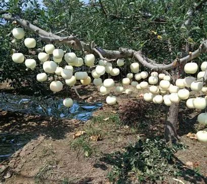 我們?cè)谡^(guò)程中,難免有碰掉蘋果現(xiàn)象,對(duì)于掉落的蘋果,若無(wú)跌傷碰傷,可集中收集,用線系住果柄,一條線兩頭各纏一個(gè)掉落蘋果果柄,懸掛于可充分接受光照的樹(shù)干上。若果柄也掉落,可用塑料袋盛裝懸掛,只要光照充足,亦可良好上色,不影響果實(shí)商品性。