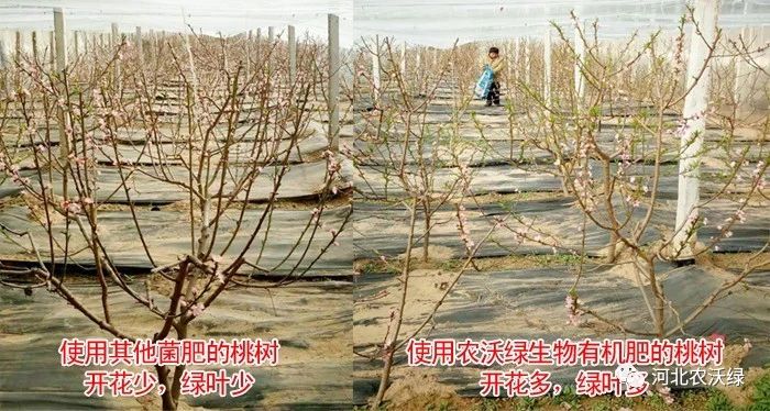 農(nóng)沃綠生物有機肥的桃樹與使用其他菌肥的桃樹相比,綠葉多,開花早,提前上市7天左右。(此圖拍攝于同一天)