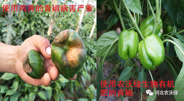 使用雞糞的青椒病害嚴(yán)重,失去商品價(jià)值,而使用農(nóng)沃綠生物有機(jī)肥的青椒表面光滑有光澤,商品性好,賣價(jià)高!