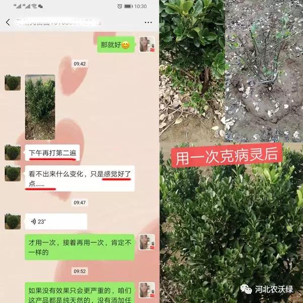 做苗木的馬經(jīng)理,前段時間黃楊葉片發(fā)黃,有病斑,掉葉等問題,后來經(jīng)業(yè)務(wù)人員介紹使用農(nóng)沃綠克病靈治療,使用一次后,效果好轉(zhuǎn),緊接著噴施第二遍。好的產(chǎn)品并不是一次見奇效,需要慢慢改善植物才會更健康,才能給您帶來不一樣的價值。(看下圖)