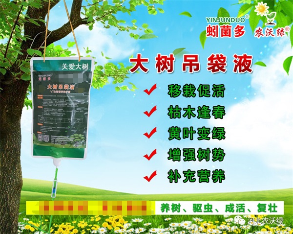 1.保持樹干及枝條新鮮;若失水或干縮,一旦發(fā)現(xiàn)要及時澆水。同時使用農(nóng)沃綠大樹吊袋液給大樹輸液,補充樹體所需水分、養(yǎng)分。