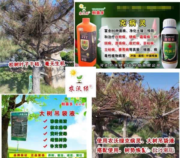 松樹使用農(nóng)沃綠克病靈、大樹吊袋液前后對比