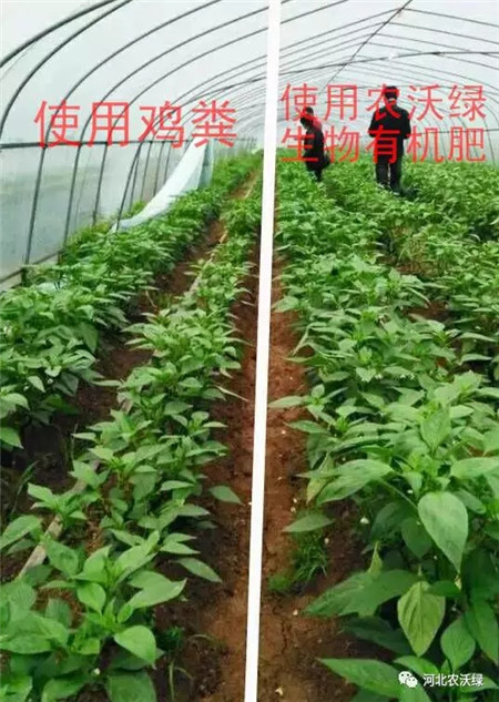 在青椒上使用農(nóng)沃綠蚓菌多生物有機(jī)肥和使用雞糞的相對比長勢更旺,植株健壯。長勢也均勻。沒有大小棵。