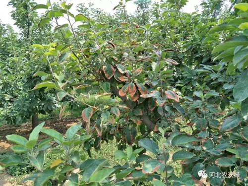 3、缺素。在蘋果樹生長過程中,由于土壤中氮、鈣、鎂、鐵等元素缺乏或因土壤板結(jié)導(dǎo)致樹體對營養(yǎng)元素的吸收受到限制時,均易引起葉片黃化,只是外觀癥狀不同而已,一般缺氮時新梢生長細而弱、葉小,淡綠色或黃色,嚴(yán)重時會引起落葉和落果;缺鈣,在小枝的嫩葉上發(fā)生褪色及壞死斑點,葉子邊緣及葉尖有時向下彎曲,褪色部分顏色先呈黃綠,一兩天內(nèi)變成黃褐色;缺鐵時近新梢頂部的葉片完全變成草綠色或黃色,中下部葉片葉脈成綠色,有些葉焦邊,并逐漸開始脫葉。缺鎂時葉片失綠,新梢基部成熟葉片的葉脈間出現(xiàn)黃綠色,會迅速擴大到頂部,基部葉片夏末脫落,頂部葉片仍保留;嚴(yán)重缺乏時植株干死;葉子小,最終變脆,邊緣向上卷曲;嫩葉較弱小,易受菌類侵襲,提前落葉(但新稍頂端的葉則不脫落),一般缺鎂時在八月中旬就開始落葉,嚴(yán)重缺鎂時則在六月中、下旬便開始落葉。蘋果樹缺鎂癥狀比較特殊,在缺鎂初期,葉片還未出現(xiàn)壞死,好像氮素充足似的,表現(xiàn)為深綠色,因此一定要認(rèn)真觀察,萬萬不可判斷錯誤。對幼齡的蘋果樹,植株頂部嫩葉逐漸失綠,以后新梢基部成熟葉片的葉脈間出現(xiàn)淡綠或灰綠色斑點。這些斑點很快就擴散到葉子邊緣,幾個小時后,葉子即變?yōu)榈稚�,一兩天后即卷縮脫落。落葉從老葉開始,以后迅速擴展到頂端,最后只剩下薄而淡綠的葉子。