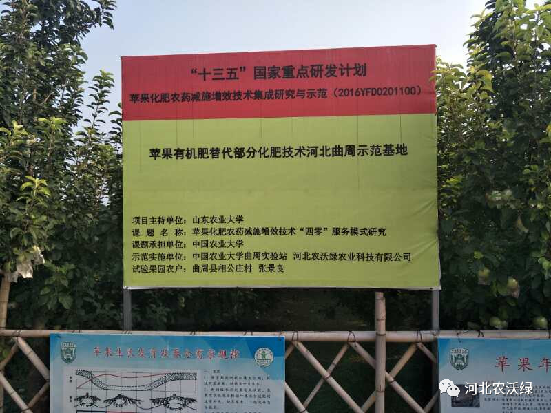 快到果園的時(shí)候,遠(yuǎn)遠(yuǎn)看見一個(gè)豎立起來大的牌子,牌子上寫了一行大字“十三五”國家重點(diǎn)研發(fā)計(jì)劃�?磥�,村民所言非虛!這更激起了筆者的好奇心,又往前走進(jìn)了一些,“蘋果有機(jī)肥替代部分化肥技術(shù)河北曲周示范基地”的字樣也就映入了眼簾。似乎看出來筆者心理的疑惑,張大哥這才笑呵呵的講起這片果園故事的由來。
