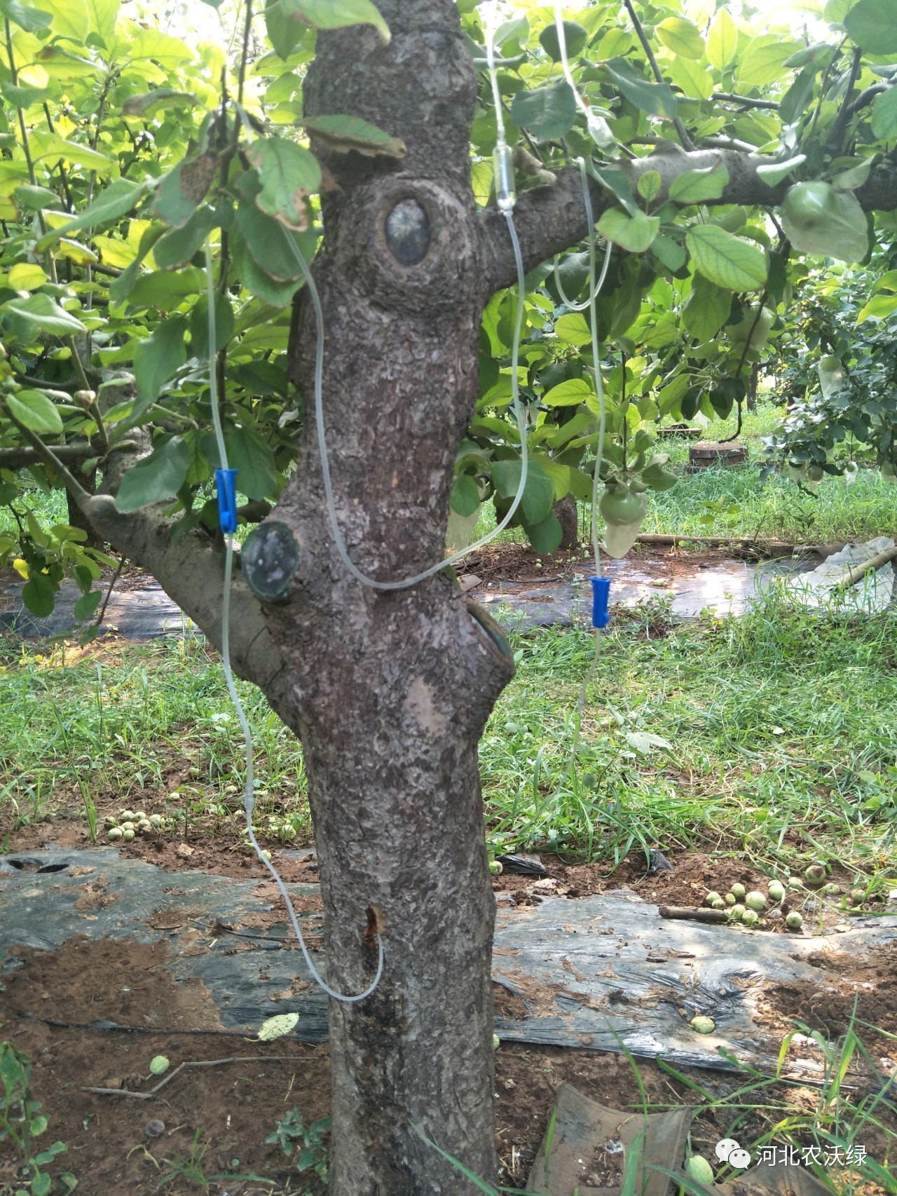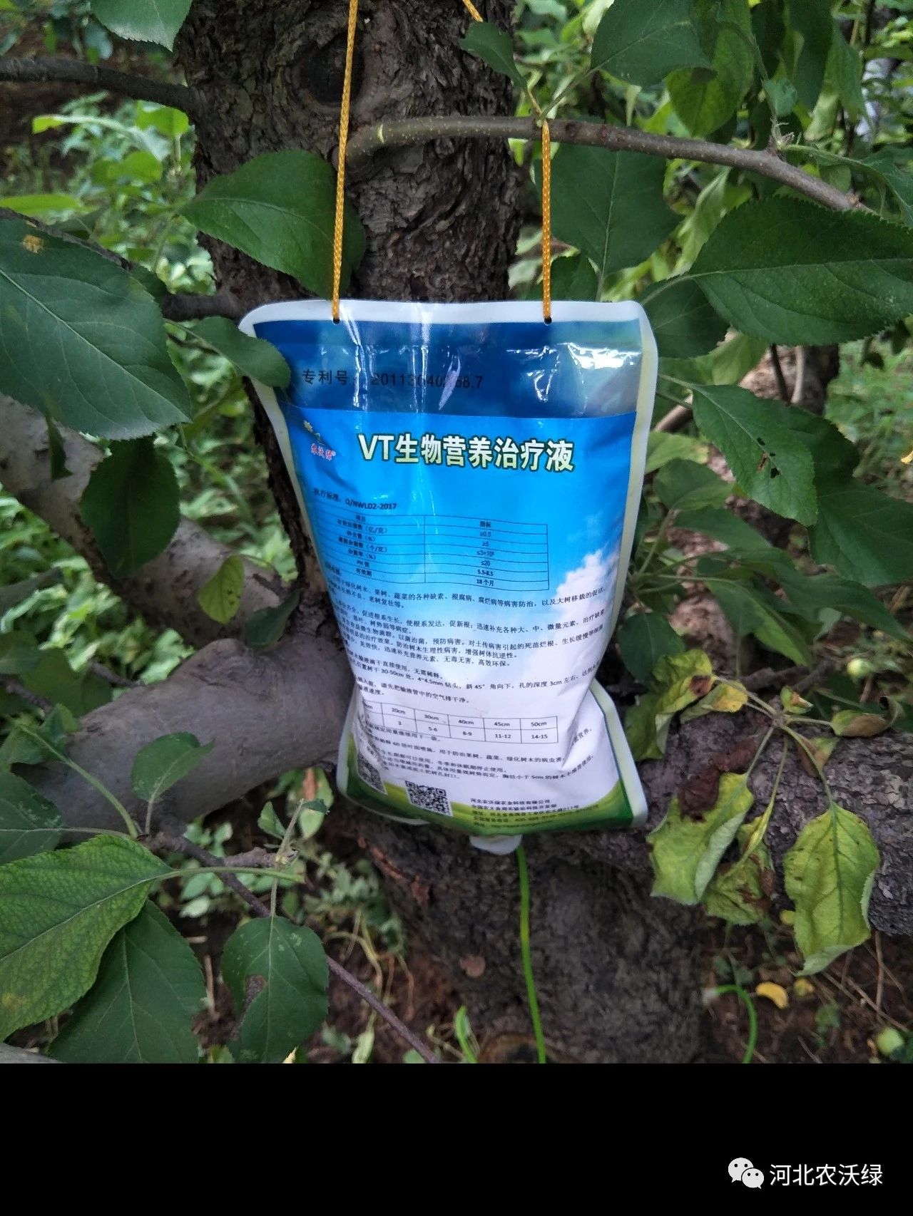 按照工作人員的指導(dǎo)施肥和管理后張大哥覺得果園今年長勢比往年要好,掛果量也明顯增多了。看到效果后張大哥又聯(lián)系了工作人員,希望對方能幫助他解決蘋果葉片黃化問題,很快就有工作人員來果園了解情況,并向他推薦了使用農(nóng)沃綠VT營養(yǎng)治療液給果樹輸液的方案,可以對果樹黃化采取輸液滴干治療的方式解決果樹病癥。