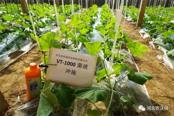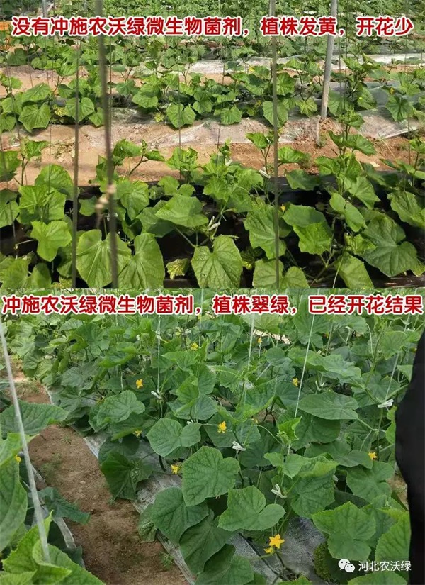 確定原因后,公司經(jīng)理建議沖施農(nóng)沃綠微生物菌劑,一畝地沖施一壺,改善土壤透氣性,促進(jìn)瓜苗生長,當(dāng)天下午在公司經(jīng)理的指導(dǎo)下就沖施上了。近期,我們又來到張大哥的大棚,再次相見,張大哥完全沒有了之前的愁容滿面,一臉高興啊,再看棚內(nèi)情況,瓜苗綠油油的長勢特別旺盛,莖稈粗壯,刨開根部,毛細(xì)根數(shù)量明顯增多,而且根系發(fā)達(dá)。張大哥說:“沖施你們這個微生物菌劑后,我天天觀察,大概在5.6天的時候發(fā)現(xiàn)已經(jīng)有新葉開始生長了,刨開根部,已經(jīng)滋生了很多毛細(xì)根,之后一直觀察,到現(xiàn)在植株翠綠,很健康,甚至比另一側(cè)的開花還要早還要多呢”。